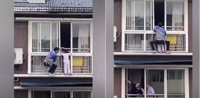 5月21日,四川富顺县一个5岁女童翻出6楼窗外,居民赶紧在楼下撑起被子,路过的小伙胡云川则从5楼阳台爬到6楼把孩子塞回屋内。