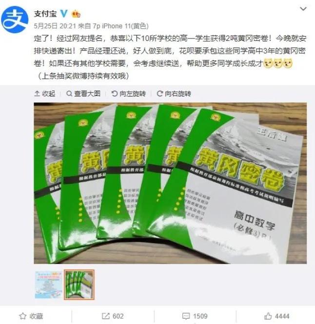 前段时间,支付宝发布了学杂费支持分期的微博,评论里有家长在呼唤学习资料,所以花呗产品经理决定除了学杂费分期,再买2吨黄冈密卷送人。