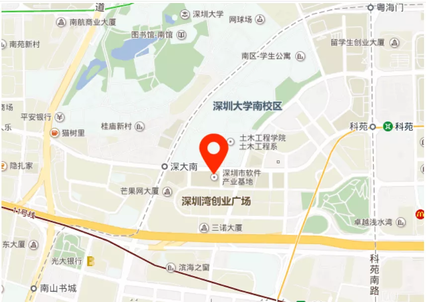 深圳市软件产业基地,东接科技公园,西临白石路,南靠滨海大道,北至学府路,中间科园路南北穿越。