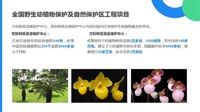 野生动植物在保存着丰富的遗传基因多样性,在拓展人类未来生存空间等方面具有难以估量的价值。为此,2001年12月21日,全国野生动植物保护及自然保护区建设工程在京启动,并重点实施大熊猫、朱鹮、虎、金丝猴、藏羚羊、扬子鳄、亚洲象、兰科植物、苏铁植物等15大极度濒危的珍稀物种的拯救和繁育,其中全国仅有两个植物类物种资源保护中心兰科、苏铁种质资源保护中心落户罗湖。苏铁种质资源保护中心迁地引进保存苏铁类植物246种,收集中国苏铁属植物近200个居群2000多份分子材料。兰科种质资源保护中心收集保存兰科植物种质资源2万多份,1500余种,其中活体160多万株。建立了兰科植物专类标本馆,馆藏腊叶标本4000多份,影像照片20多万张,标本信息3万余份。