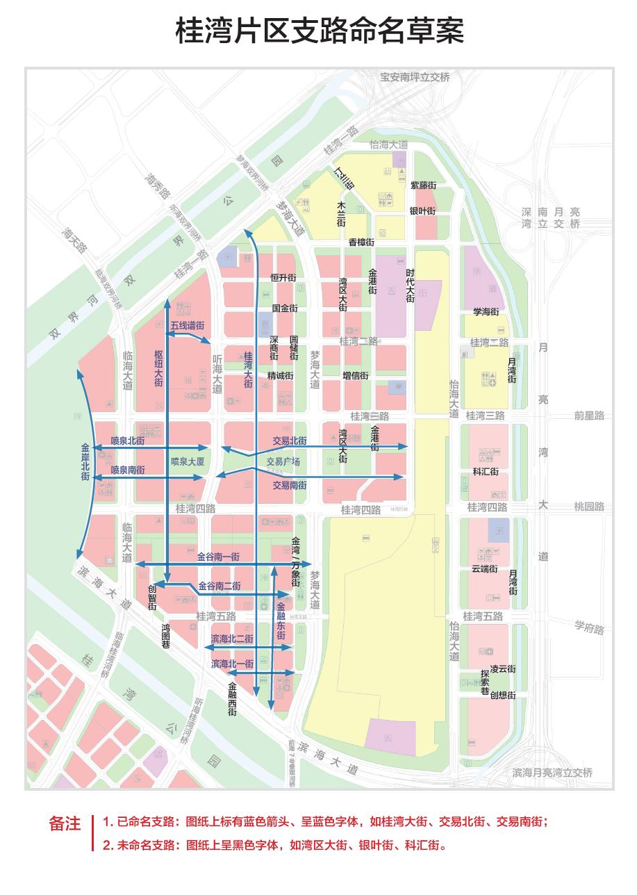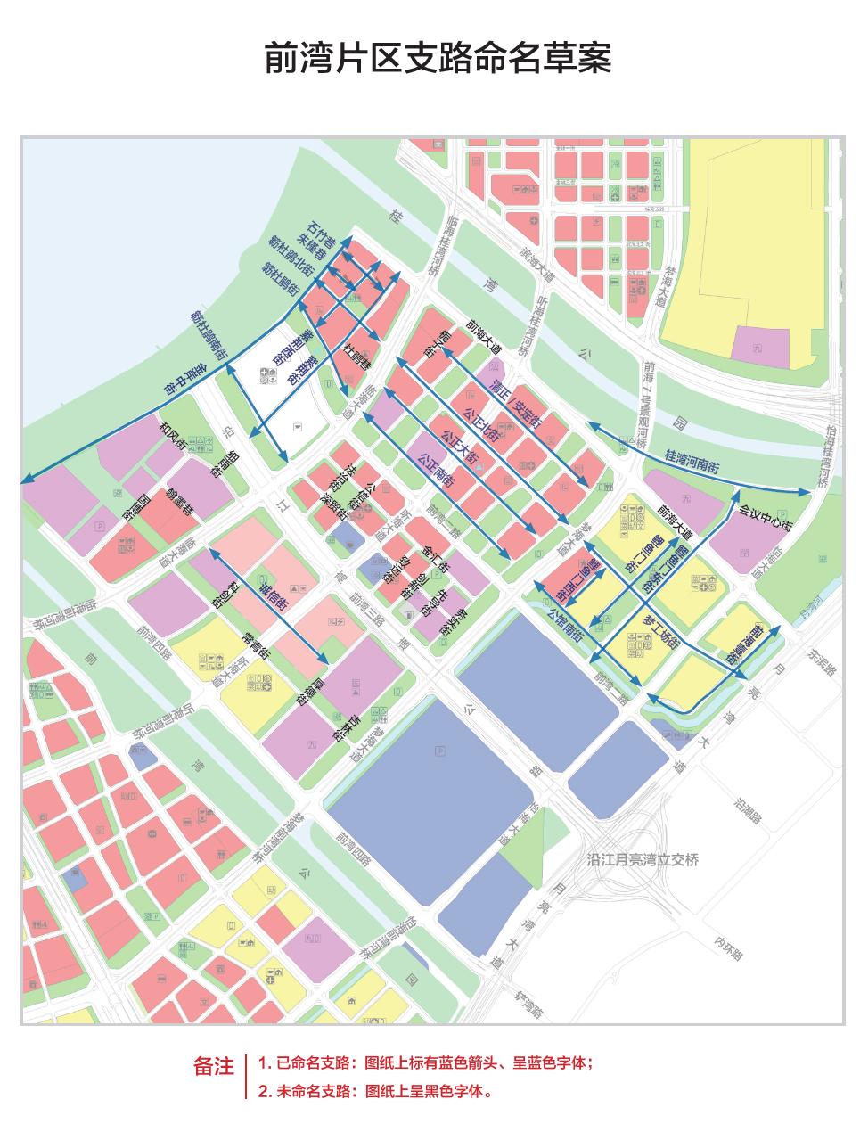 其中,桂湾片区共约37条(包括已命名支路13条,本次拟定支路命名草案24条),前湾片区约39条(包括已命名支路20条,本次拟定支路命名草案19条),妈湾片区共61条(包括已命名支路12条,本次拟定支路命名草案49条)。同时,将代表前海门户通道的主干道“前湾一路”更名为“前海大道”。