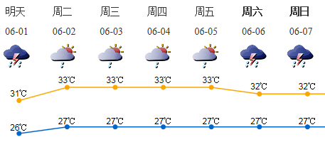 6月1日有雷阵雨,局部暴雨,季风降雨易出现在早晨到上午时段,气温26-31℃。
