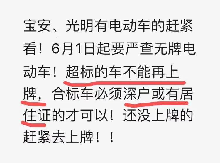 见圳客户端·深圳新闻网2020年6月2日讯(见圳客户端、深圳新闻网记者 郑晓鹏)近日,网上流传着这样一张图片,图片上称,6月1日起宝安、光明电动二轮车备案通道要关闭了。消息一出,便引起网友的广泛关注“真的假的?”“那我的电动车还能上牌吗?”“超标车是什么车?合标车又是什么车?”……记者从深圳市交警局获悉,6月15日起,宝安区和光明区超标的电动二轮车将不再予以发放黄色过渡期标识;对于符合新国标标准的车辆,市民持深圳户籍身份证或居住证即可办理电动二轮车备案,发放可长期使用的白色标识。已备案的并发放黄牌标识的车辆仍可继续使用,过渡期至2021年12月31日。