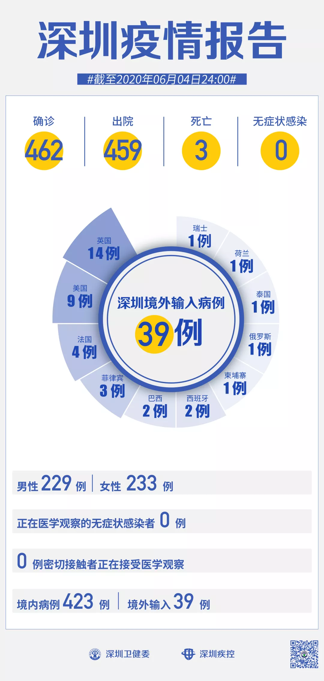 截至6月4日24时,深圳累计报告新冠肺炎病例462例。