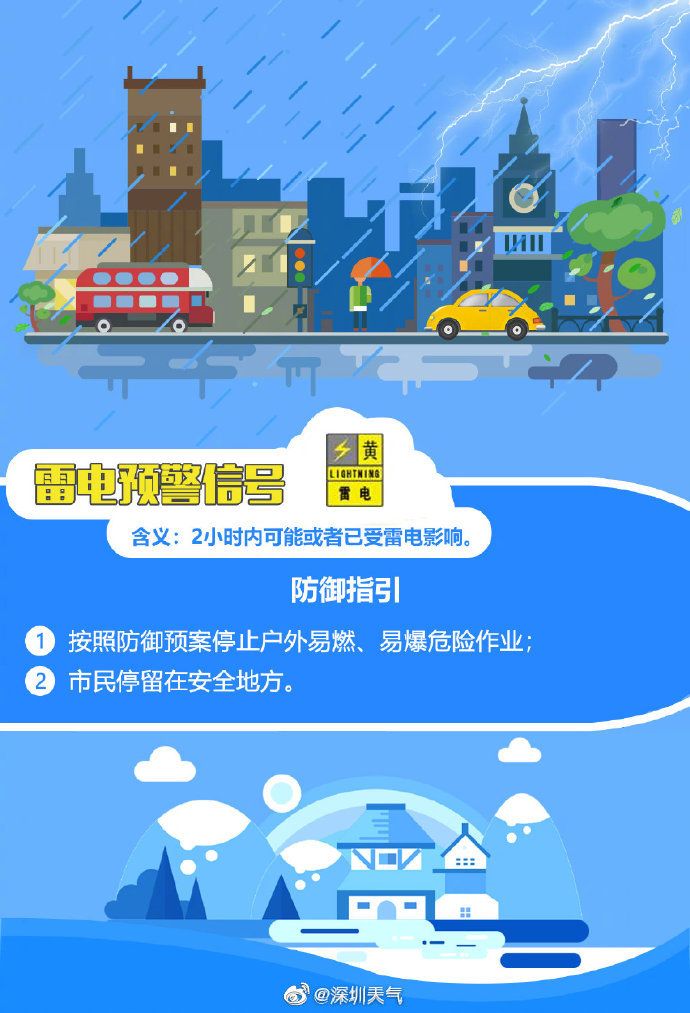 深圳市气象台于2020年06月05日11时15分在全市发布雷电预警,预计2小时内全市将受雷电影响,市民停留在安全地方;按照防御预案停止户外易燃易爆危险作业,并加强危化场所安全管理。