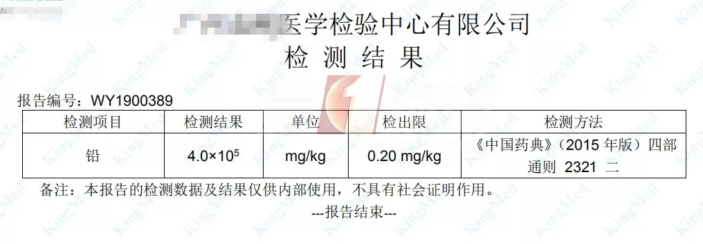 听了医生的建议,孩子家长将瓶子里的粉末拿到第三方检测公司检测。结果显示,1克的药粉里面,就含有大概0.4克的铅!