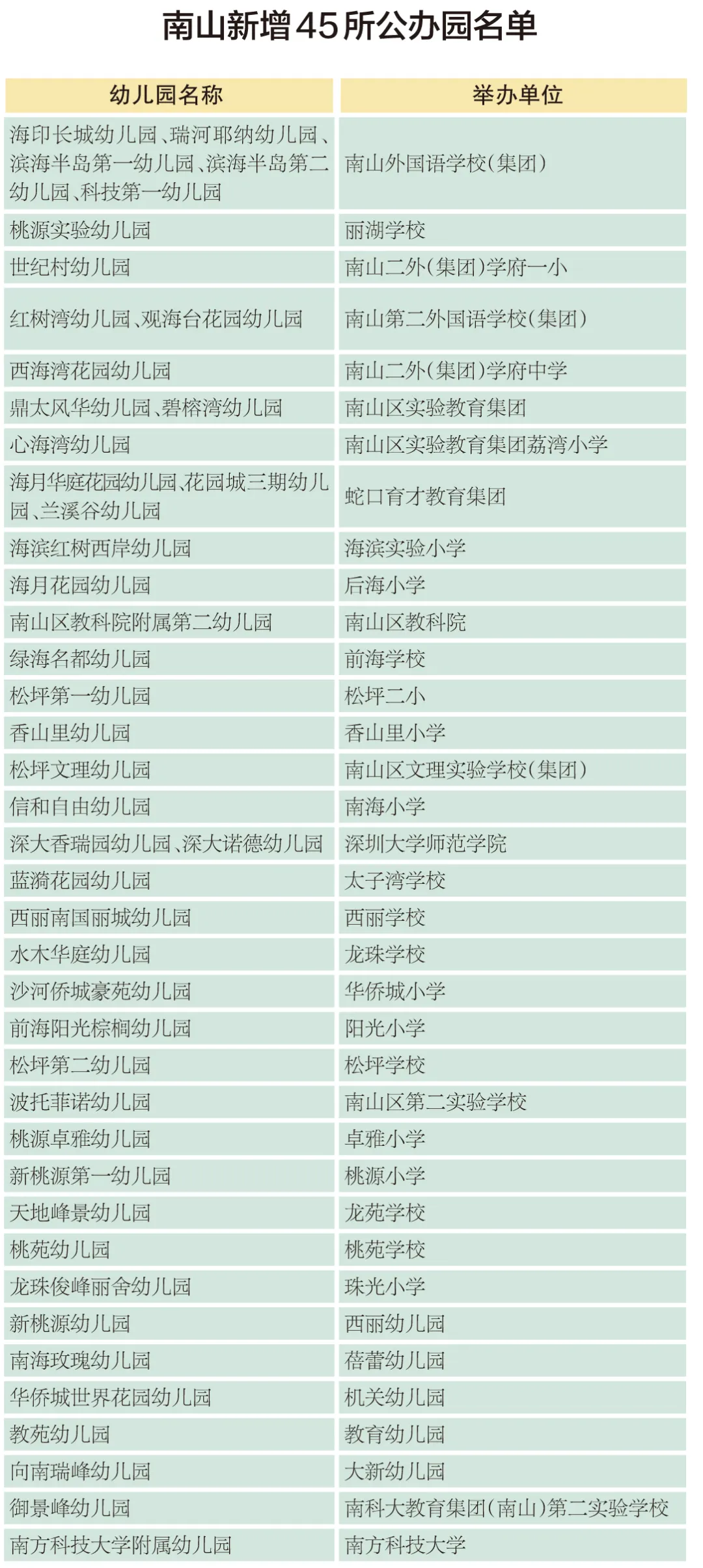 另外2所为新建幼儿园分别是由育才教育集团举办的兰溪谷幼儿园、由南方科技大学教育集团举办的御景峰幼儿园,将于今年9月开学。还有41家民办幼儿园均为政府产权到期移交,转公办园后,交由南山区各教育集团、学校和已有公办园举办。