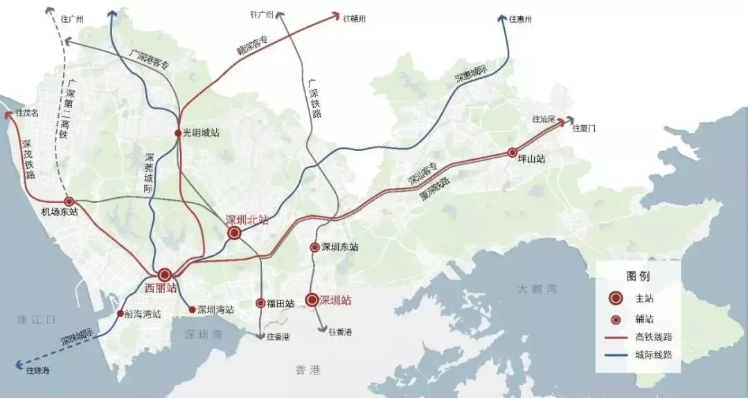西丽综合交通枢纽将引入赣深客专、深茂铁路、深汕铁路、深珠城际4条高铁,深惠城际、深莞增城际2条珠三角城际铁路和轨道13、15、27、29号线4条城市轨道。