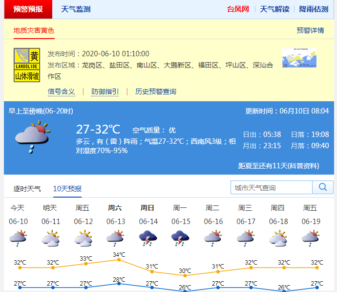 市气象台预测,10日我市(含深汕)多云,有短时(雷)阵雨,局部大雨,本轮“龙舟水”过程趋于结束。11-13日多云,有短时(雷)阵雨,天气渐趋闷热。