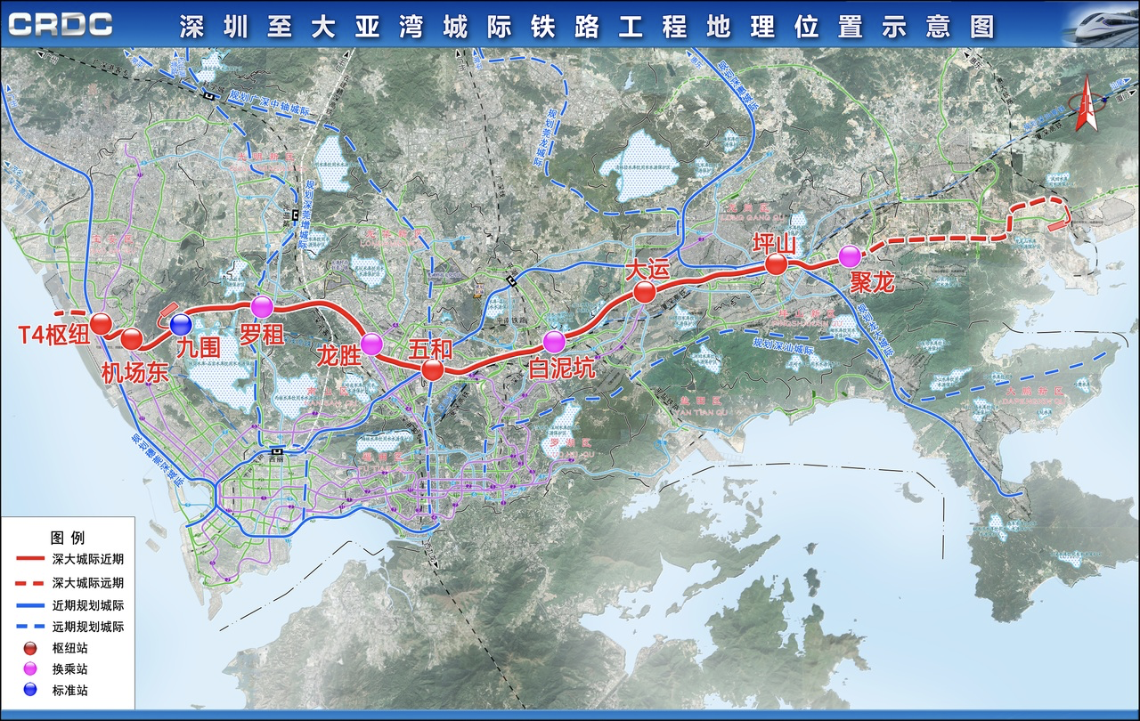 深大城际全线拟设13座车站,其中深圳市境内10座,惠州市境内3座,线路全长86.83km(深圳市72.20km,惠州市14.63km),深圳段均采用地下敷设。该线路串联深圳北部第二圈层多个组团,对实现大亚湾、坪山、大运、五和枢纽等关键节点与深圳机场的快捷联系有重要意义。