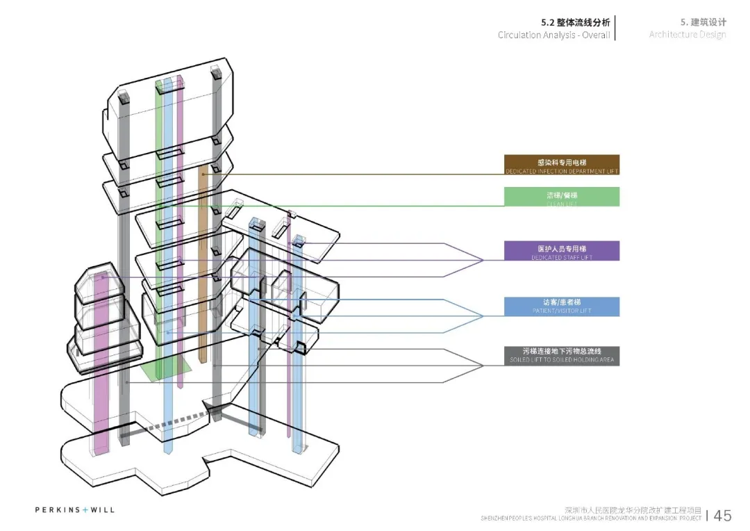 在建筑中通过电梯、物流传送系统、标识设计、医疗智能化的专项研究设计,提升就医的便捷性和效率。