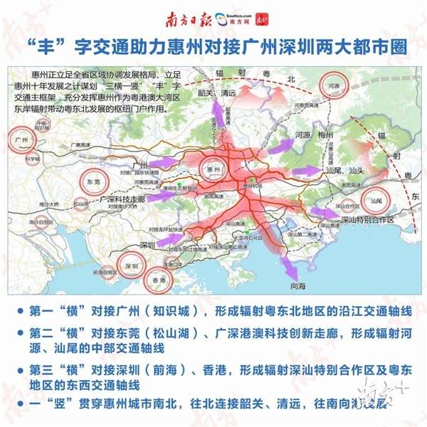 引人关注的是,惠州还大手笔启动实施“丰”字交通主框架,将打通内联全市7个县区、外通广深莞等6个城市、加速“融湾向海”的黄金通道,建设大湾区连接粤东、粤北以及闽赣地区的枢纽门户。