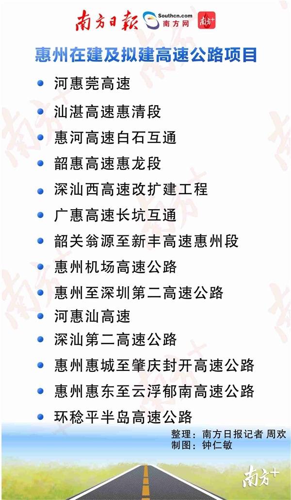 今年惠州市政府工作报告明确,将建成河惠莞高速惠州段、汕湛高速惠清段、惠河高速白石互通,加快建设韶惠高速惠龙段、深汕西高速改扩建工程、广惠高速长坑互通,启动环稔平半岛高速公路建设。同时,将加快惠州千万级干线机场规划建设。
