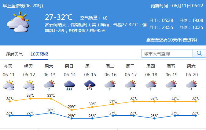 市气象台预测,11-13日多云到晴天,偶有局地短时(雷)阵雨,天气闷热,11日气温27-32℃;展望14-15日有一次降雨过程。