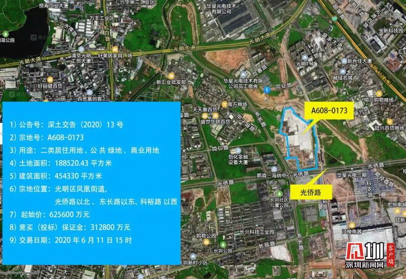 四宗地中,光明A608-0173宗地位于光明区凤凰街道光侨路以北、东长路以东、科裕路以西,土地用途为二类居住用地、公共绿地、商业用地,土地面积为18.85万平方米,建筑面积为45.43万平方米。该地建设住宅类型为公共租赁住房、只租不售的人才住房和普通商品房,初始配建公共租赁住房和只租不售的人才住房各5万平方米。项目建成后,普通商品住房最高销售均价为4.75万元/平方米(不含室内装修)。