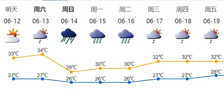12-13日多云,偶有短时(雷)阵雨,天气炎热;14-15日有一次明显风雨过程;16日仍有明显降雨;17-18日多云,有阵雨或雷阵雨。