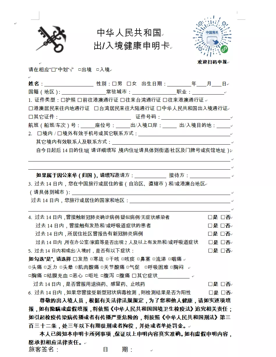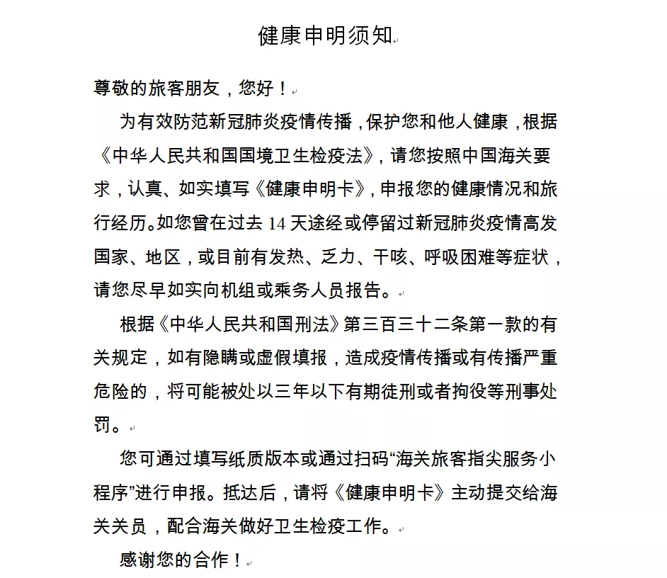 一、请提前下载打印《健康申明卡》(见附件1),或关注“海关旅客指尖服务小程序”(见附件2)。提前如实填写纸质或电子健康申报信息,通关时主动向海关申报。