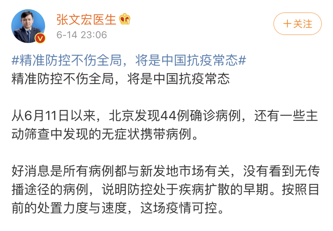 6月14日,张文宏医生在微博上发布了名为《精准防控不伤全局,将是中国抗疫常态》的文章,针对北京近日新发的新冠疫情,他是这么说的: