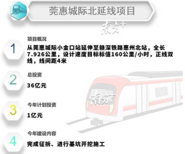 南方日报、南方+记者留意到,前不久,惠州市发改局在《惠州市2020年重点建设项目计划》中,已经把莞惠城际北延线项目列为今年新开工项目。该线路设计速度目标标值160公里/小时,正线双线,线间距4米。