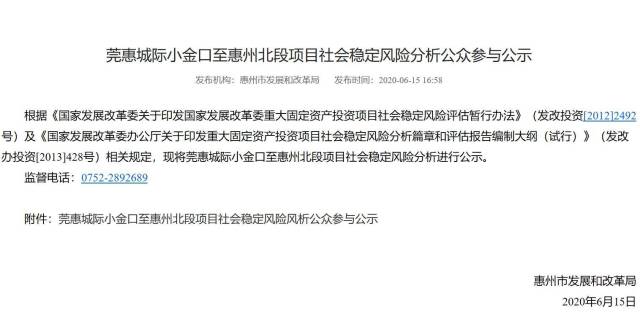 6月15日下午,惠州市发改局发布《莞惠城际小金口至惠州北段项目社会稳定风险分析公众参与公示》,征求公众对项目建设的意见和建议。