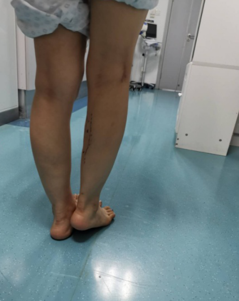 20岁出头的杨柳(化名)右小腿注射肉毒素后发生肌肉挛缩,导致右足跟不能着地,双下肢不等长,跛行。