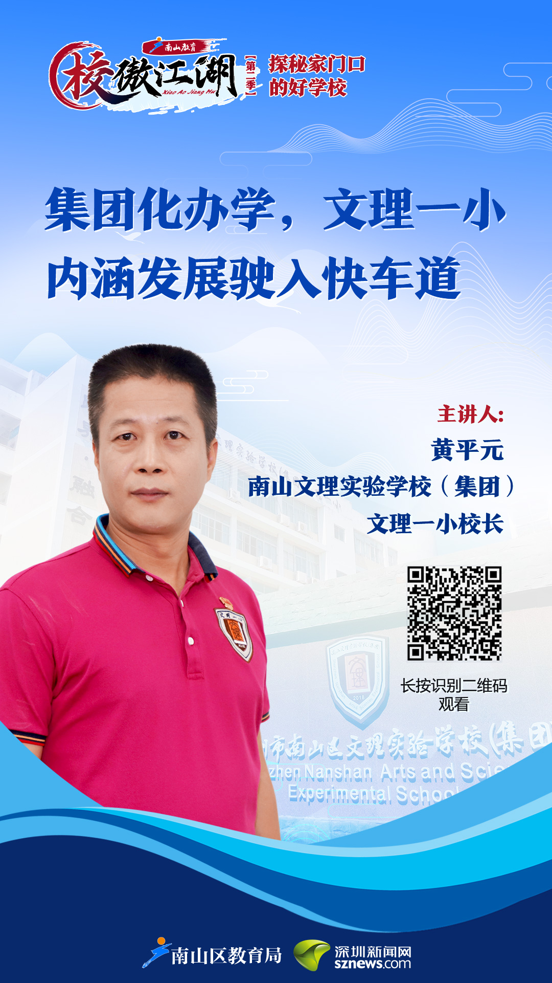 《校傲江湖》第二季——探秘家门口的好学校,带着大家与校长面对面,探索南山各所优质学校,了解它们的办学特色,领略它们的魅力!在上一期节目中,校傲江湖探访了南山区文理学校(集团)科创学校,南山区文理学校(集团)总校长兼科创学校校长吴希福为大家详细介绍了科创学校的教育理念。本期节目来到南山文理实验学校(集团)文理一小,文理一小校长黄平元面对面介绍集团化办学后,文理一小内涵发展驶入快车道的全面情况。