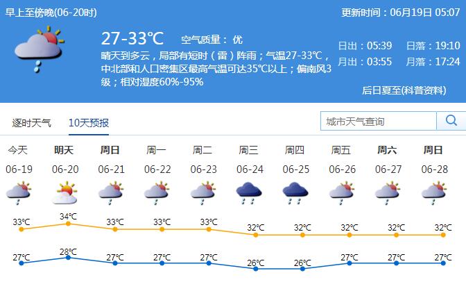 见圳客户端·深圳新闻网2020年6月19日讯 19日晴天间多云,局部有短时(雷)阵雨;气温27-33℃,北部地区最高气温34-35℃。偏南风3级,雨时短时阵风6级;相对湿度60%-95%。20日晴天间多云,局地有短时热雷雨,天气闷热;21-23日多云有雷阵雨。