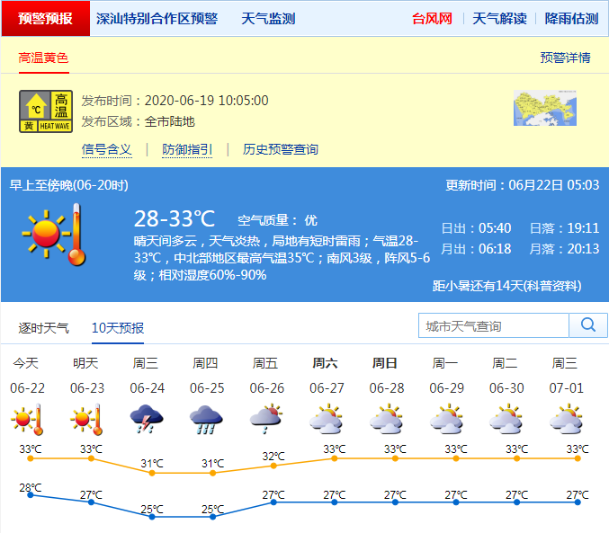 见圳客户端•深圳新闻网2020年6月22日讯 据深圳气象局消息,6月22日,深圳晴天间多云,天气炎热,局地有短时雷雨;气温28-33℃,中北部地区最高气温35℃;南风3级,阵风5-6级;相对湿度60%-90%。