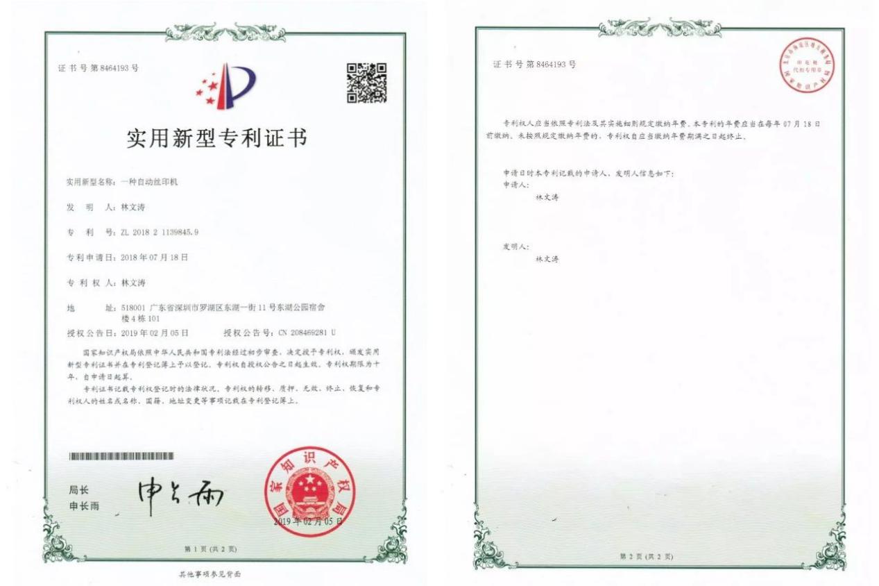 2019年12月,林文涛参加中国科协举行的“全国青少年科技创新大赛”,获得深圳市二等奖。他发明的成品雨伞自动丝印机,荣获实用新型专利证书。这种自动丝印机,极大地提高了工作效率,在一把雨伞上印刷一个logo仅仅需要单人5秒的时间。