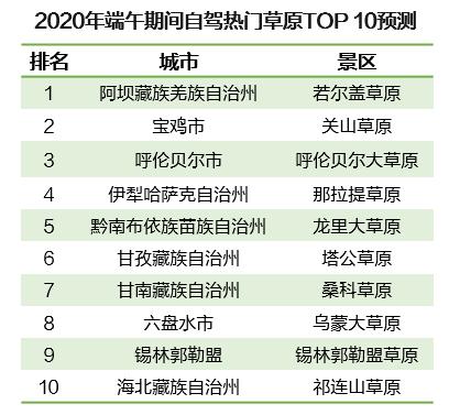 6月正是“草原游”较为适宜的时节,广袤的草原游可为这个夏天增添一丝清凉。《报告》预测,端午小长假期间,全国热门自驾草原TOP10主要分布在市郊,最热门的是阿坝-若尔盖草原,其次是宝鸡-关山草原以及呼伦贝尔大草原。
