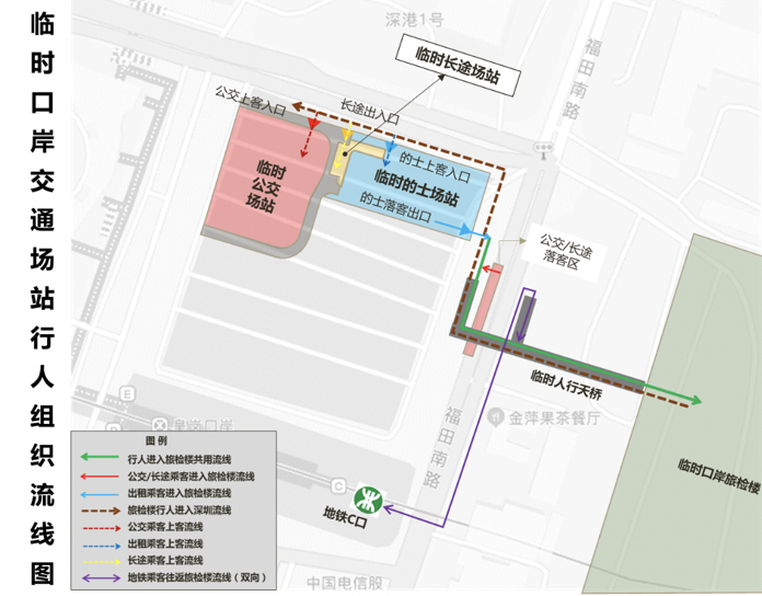 由深圳出境去往香港的行人流线为“交通接驳场站落客位/皇岗口岸地铁站C出口→临时人行天桥→临时口岸旅检楼→香港”,香港入境到达深圳的行人流线为“临时口岸旅检楼→临时人行天桥→交通接驳场站上客位/皇岗口岸地铁站C出口”。详细交通组织流线见下图。