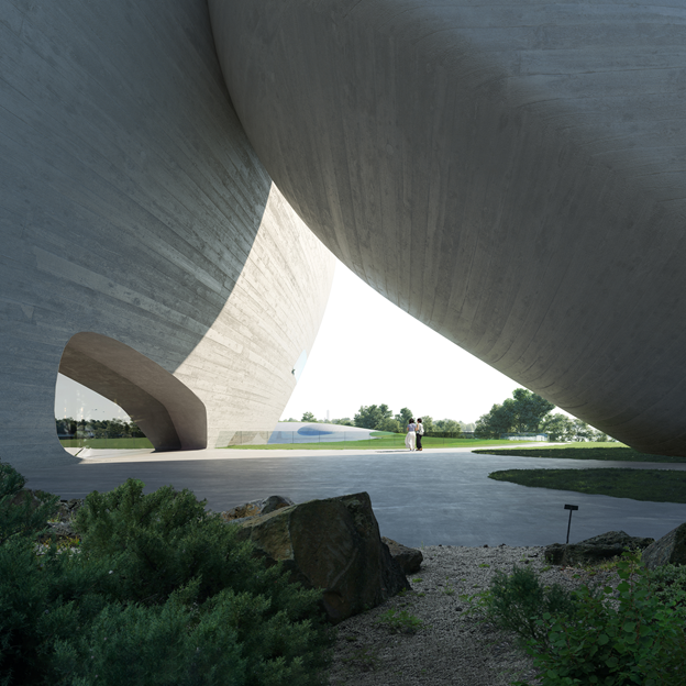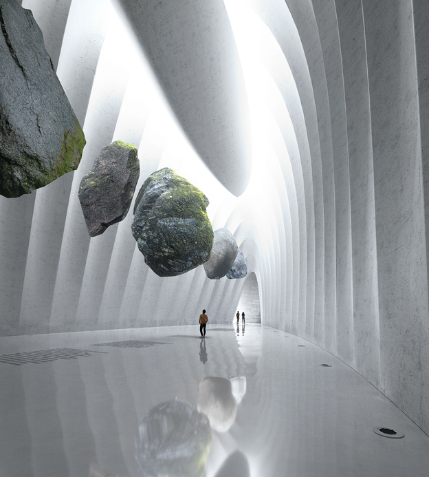 MAD的方案将较大体量的标准展览空间、公共教育场地、图书馆、接待大堂、咖啡厅、配套商业等功能放置在首层并覆土,屋顶形成绿地与城市直接连接,构成这个区域面积最大的公园。顺应建筑的曲线,屋顶坡度自然发展,柔和回落大地,接壤之处设计成数个下沉庭院,高低相合,延绵不断。