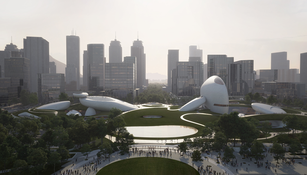 该项目由著名建筑师马岩松带领的MAD建筑事务所负责项目方案设计。方案显示,将以“远古”和“未来”两大概念,通过步道串联起散落石群建筑、绿地、公共活动区,展现原始氛围与未来力量的结合。在南馆与北馆两个展馆中间设有架空中轴景观连桥,其中超高层的石群展厅将打造出炫目的展览效果。此外,广场还将连接深圳人才公园,形成一片连续的开放空间。
