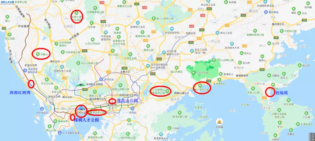 深圳湾公园、西湾红树林公园、莲花山公园、深圳人才公园、世界之窗、光明小镇花海、凤凰山森林公园、梧桐山风景名胜区和大、小梅沙海滨公园。