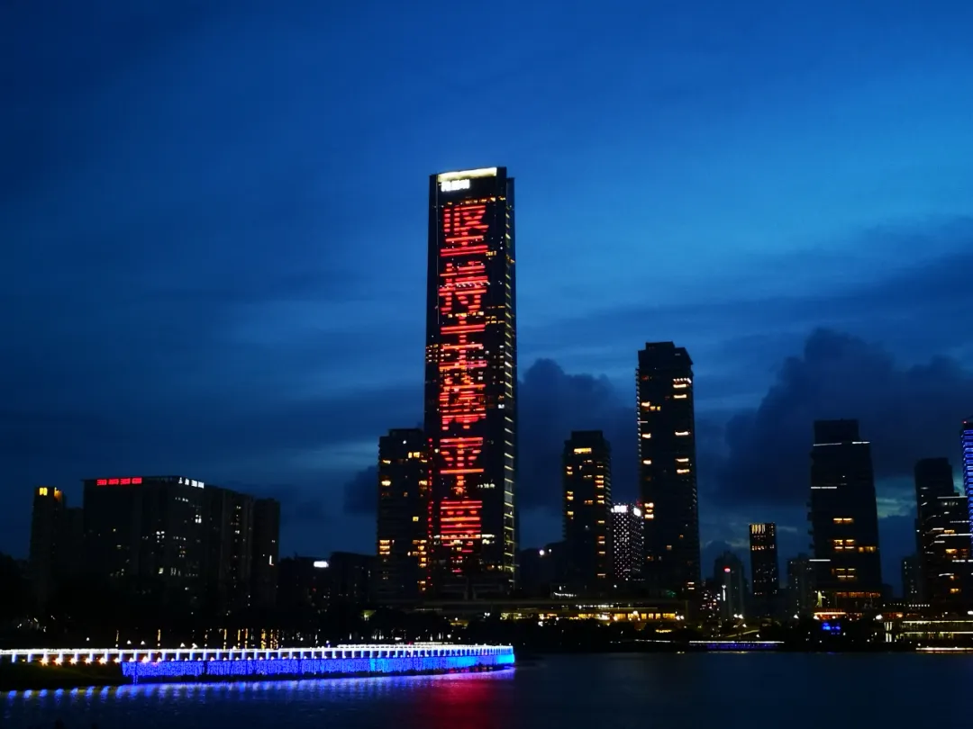 平安国际金融中心、京基100大厦、深圳汉国城市商业中心、深圳湾1号、中国华润大厦五座城市地标的外立面上,同时亮起了绚丽的灯光。