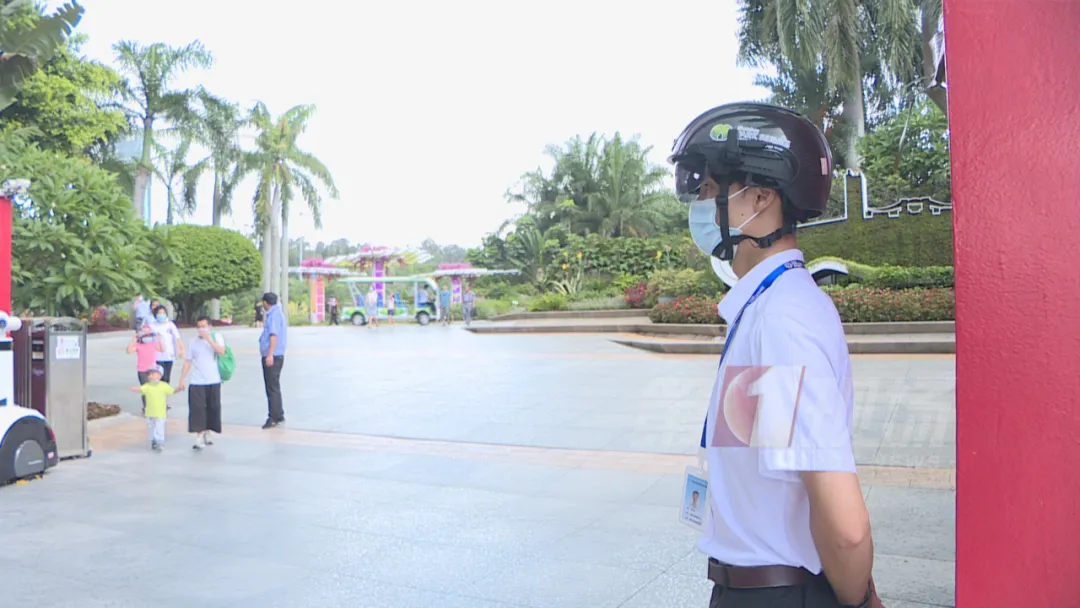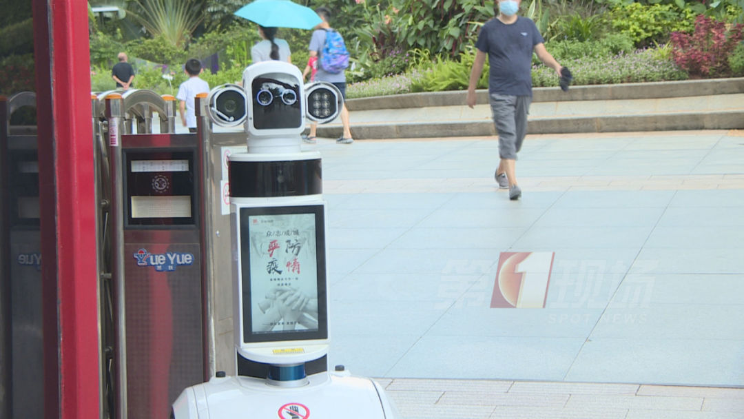 在莲花山公园的南门口,安保人员戴着一顶智能头盔,入园游客的体温,可以实时显示在眼前的屏幕上,一旦温度达到37.3℃,就会发出警报。如果游客没有戴口罩,门口的智能机器人也会提醒:“请您戴上口罩”。