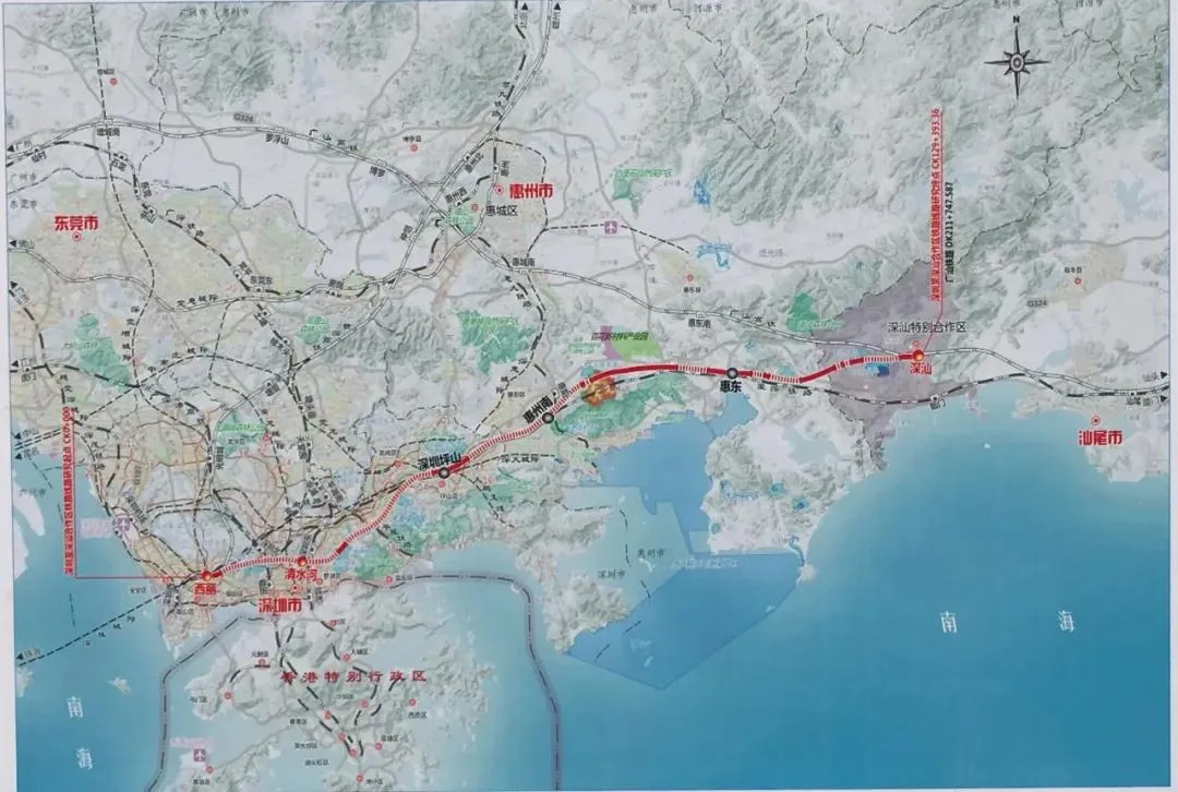 深汕高铁:起自西丽站,经南山区、罗湖区、龙岗区、坪山区、惠州市至深汕特别合作区深汕站,衔接广汕铁路,全长127公里。