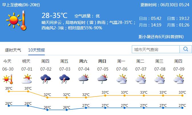 见圳客户端·深圳新闻网2020年6月30日讯 我市今天晴天间多云,局地有短时(雷)阵雨;气温28-35℃;西南风2-3级;相对湿度55%-90%。