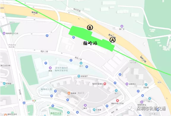 翰岭站位于福田区翰林学校北侧、梅观路南侧,站位靠梅观路南侧大致呈东西向布置。该站为地下明挖两层岛式车站,共设出入口2个:A、B。