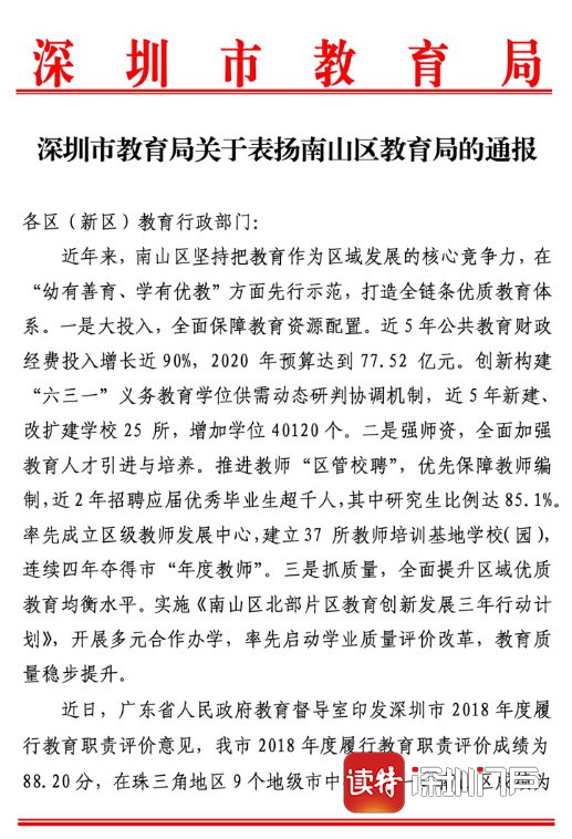 见圳客户端·深圳新闻网2020年7月1日讯(深圳特区报记者 李丽)6月30日,《深圳市教育局关于表扬南山区教育局的通报》在全市教育界引起关注。通报表示,近日,广东省人民政府教育督导室印发深圳市2018年度履行教育职责评价意见,深圳2018年度履行教育职责评价成绩为88.20分,在珠三角地区9个地级市中排名第一,其中,南山区成绩为88.64分,在珠三角地区48个县(市、区)中排名第一。经研究,决定在全市教育系统对南山区教育局给予通报表扬,并希望南山区教育局率先建成全国义务教育优质均衡发展区。