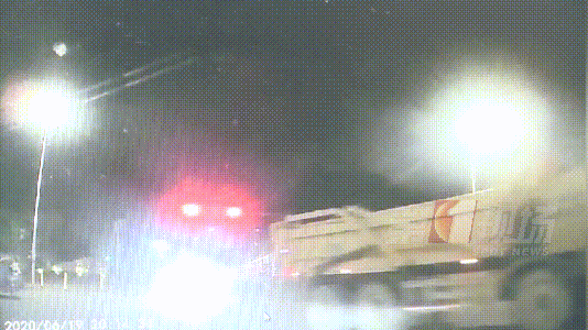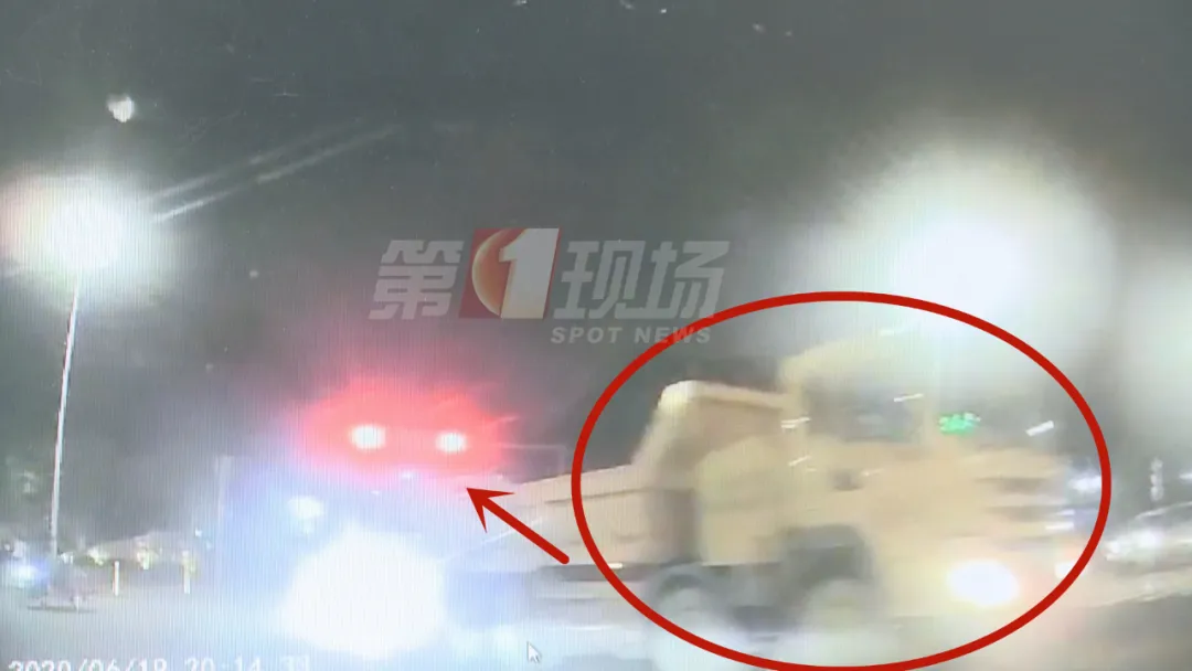 事故发生在6月19号晚上8点多,可以看到黑色小车在信号灯开始闪烁的时候开过光侨路路口,正好被一辆左转泥头车挡住了路。