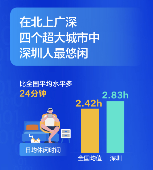 曾经有一个词叫做“深圳速度”,代表高效率高速度高质量的发展。而如今,大调查却发现了这里也别有一番慢生活,在北上广深四个超大城市中,深圳人最悠闲,日均休闲时间(2.83小时)高出全国平均水平24分钟。