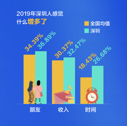 深圳人比较关注健康,不管是宅在家还是外出娱乐,他们选择运动健身的比例都超过全国平均水平,对健康的投资,成就了又一个“苗条之城”。过去这一年,有四成的深圳人感觉自已“轻松”了,体重减少的人群比例高出全国近14个百分点。甩掉了赘肉的同时,深圳人还感觉在时间、朋友、收入这三方面的收获在增加。尤其是时间,超出了全国均值8个百分点。