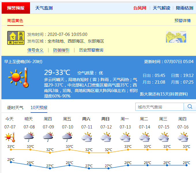 见圳客户端·深圳新闻网2020年07月07日讯 据深圳市气象台预测,今日多云间晴天,局地有短时(雷)阵雨,天气闷热,最高气温33-35℃,高温黄色预警信号生效中。8日持续闷热,有局地短时(雷)阵雨,易出现在早晨和午后;9-10日(学业考)天气闷热,有雷阵雨,部分时间雨势较大,最高气温32-33℃。