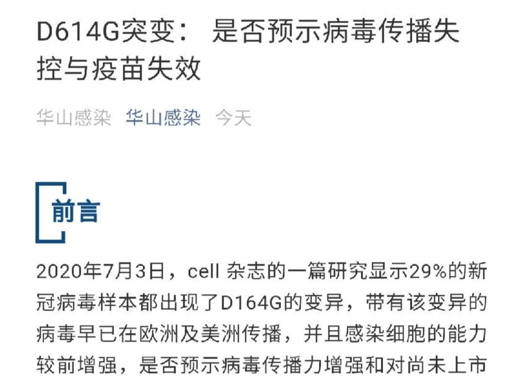 张文宏称,特别是在7月3日,国际著名杂志《细胞》发表文章显示,29%的新冠病毒样本出现了D164G的变异,此次北京疫情反弹中发现的病毒株也有这个突变。