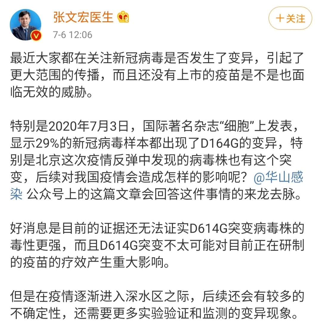 7月6日,上海复旦大学附属华山医院感染科主任张文宏通过微博谈“29%新冠病毒样本现D614G变异”一事。