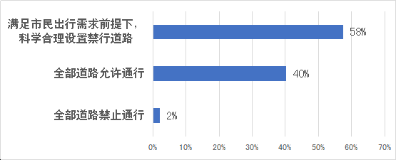 据调查,约58%的市民支持在满足市民出行需求前提下,科学合理设置禁行道路;40%的市民认为应该全部道路允许电动二轮车通行;仅2%的市民认为电动二轮车应当在全部道路禁止通行。