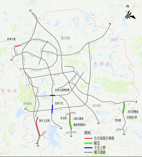 其中,107国道(不含辅道)、前进一路、宝石路(不含辅道)已列入宝安区电动二轮车禁行道路。宝安大道、松白路、静宁路、公常路、公园路、创业一路、公明北环、宝石路辅道、前进二路现有非机动车道设施完善,可供电动二轮车骑行,不列为禁行道路。