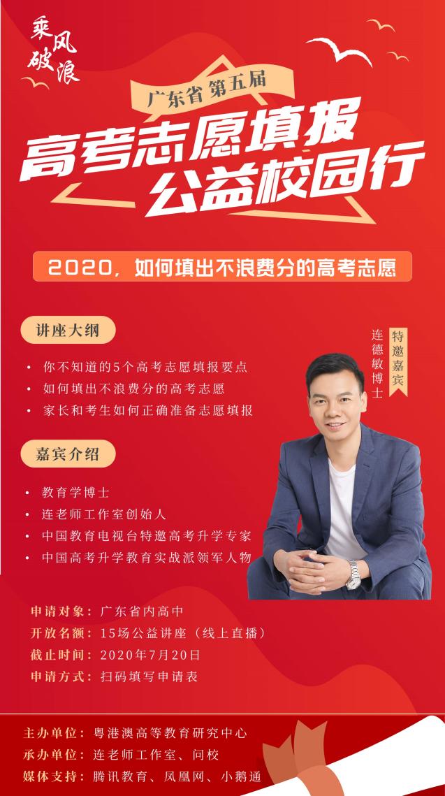 见圳客户端·深圳新闻网2020年7月9日讯 (记者 陈彬)高考是每一位高三学子梦想的起点,但高考不只是一场考试,还有考试之后的志愿填报;如何科学、专业的填报志愿,直接关系着考生能否获得心仪大学和专业的录取。7月6日,以《2020,如何填出不浪费分的高考志愿》为主题的广东省第五届高考志愿填报公益校园行正式启动,该活动由粤港澳高等教育研究中心主办,连老师工作室承办,将面向广东省内高中,以学校或班级为单位,举办15场志愿填报公益讲座,讲座全程特邀连德敏博士担任主讲嘉宾。
