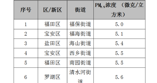 各区PM2.5平均浓度在6.1-8.3微克/立方米之间,浓度较低的有盐田区、大鹏新区、福田区和南山区,浓度较高的有光明区、龙华区和龙岗区。